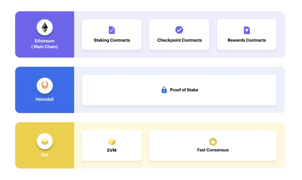 Bor Layer – also known as the Block Producer layer, operates as the sidechain. The Bor implementation serves as the sidechain operator, managing and facilitating transactions on this separate blockchain. This EVM-compatible layer allows the network to benefit from Ethereum’s functionalities and compatibility.